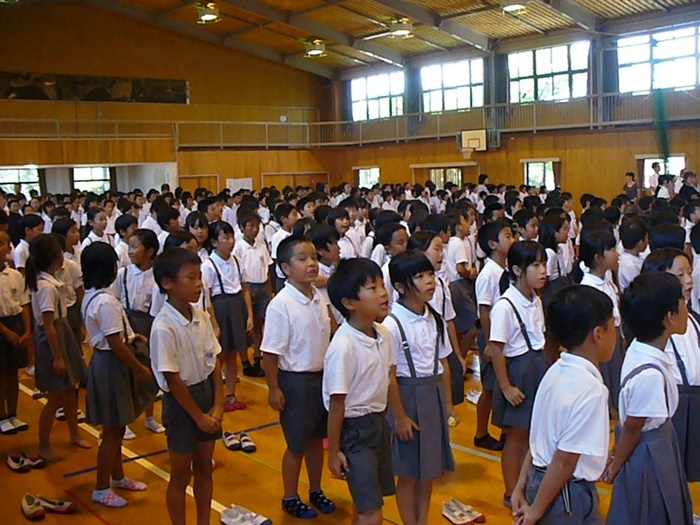 窓を開けていてもかなり蒸し暑い体育館内で、1年生から6年生まで45分間最後まで頑張りました。2学期も頑張ろうね。