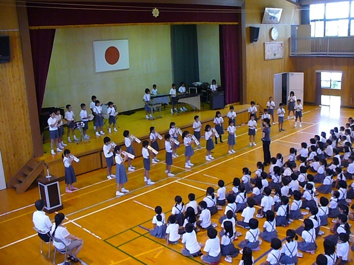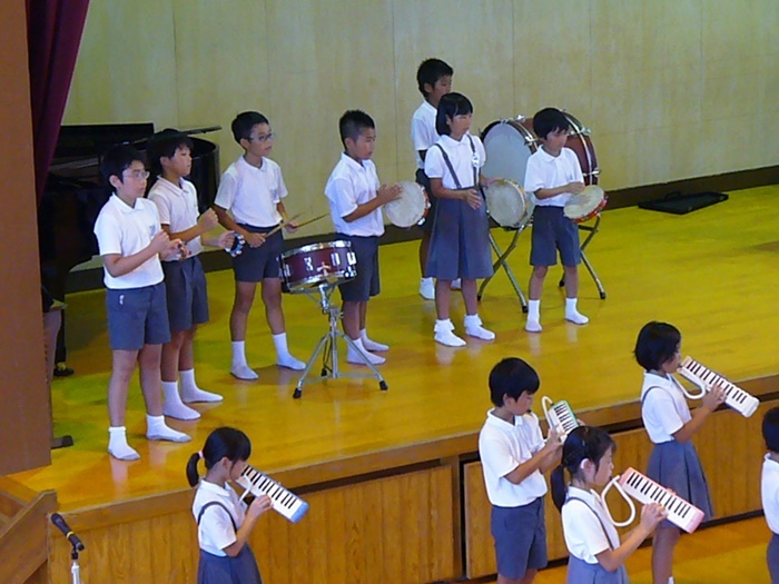 ↓明日(22日)の八代市の音楽会に出場する4年生の人たちが、みんなの前で曲を披露してくれました。