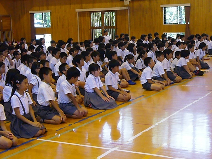 窓を開けていてもかなり蒸し暑い体育館内で、1年生から6年生まで45分間最後まで頑張りました。2学期も頑張ろうね。