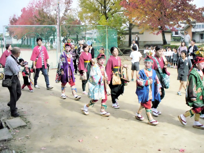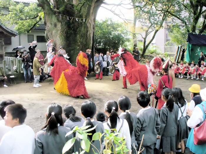 獅子舞の一行の中にはいろいろな学校の子どもたちがいますが、中央で獅子と一緒に舞ったのは代陽小学校の四年生です。