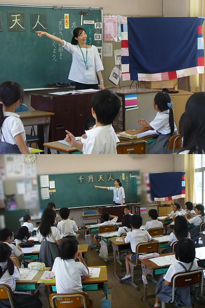 これは、書写の授業の様子です。子供たちに文字の形をイメージさせていらっしゃいました。