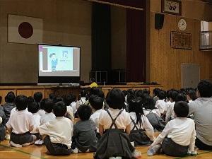 4月25日5時間目、体育館で全学年を対象に、情報モラル教育がありました。