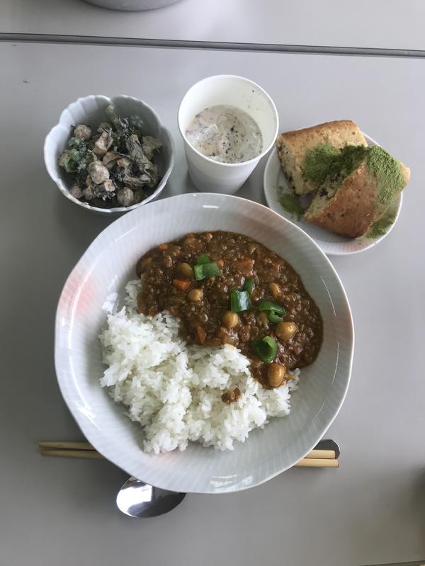 今日のメニューは、豆カレー・豆サラダ・小豆のケーキ