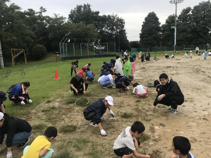 その後、運動場の除草作業を行いました。前日の雨でぬきやすくはなっていましたが、グラウンドの中まで草が生えていて、みんなで作業を行いました。