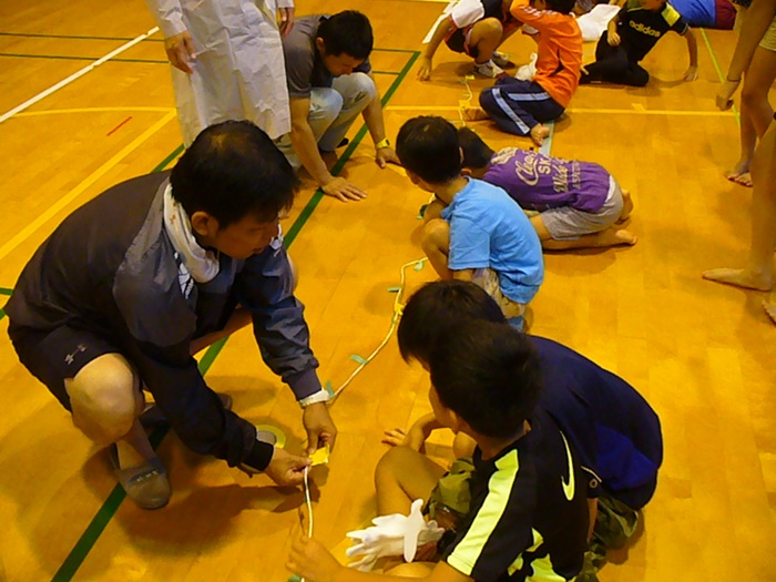 さて、今回の参加数は保護者の皆さん、子供たち全部含めて約150人。雨も降る中朝8時に体育館に集合しました。
