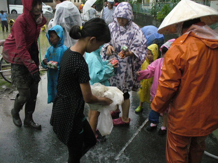 ↓皆さんお疲れさまでした。水で洗ってもらい、ジュースももらいました。次は、かかしつくりかな。