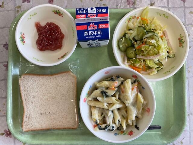 食パン、ペンネのクリーム煮、グリーンエッグサラダ、ブルーベリージャム