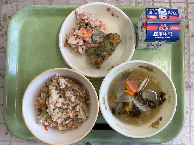 麦ごはん、高野豆腐の卵とじ、切干大根の酢の物、いりこアーモンド