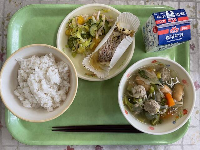 麦ごはん、ミルクスープ、タラのにんにくソース、グリーンサラダ