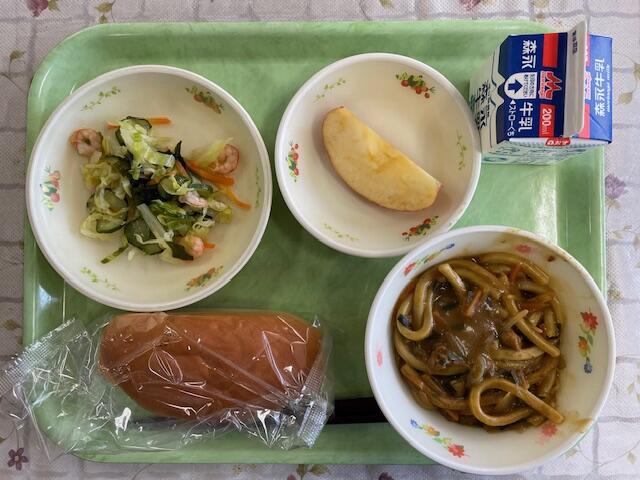麦ごはん、カレーうどん、チンゲン菜とささみのサラダ、みかん