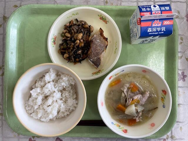 麦ごはん、けんちん汁、さばの煮つけ、ごま酢あえ