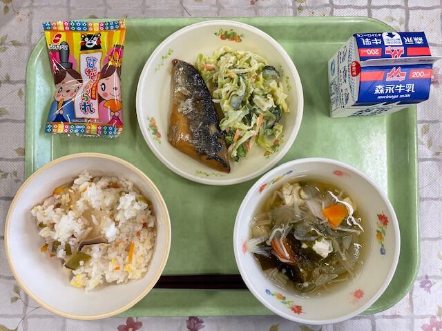 麦ごはん、いちょう葉汁、さばのソース煮、おかかあえ