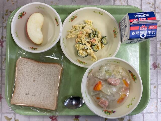 ミルクパン、チンゲンサイのクリームスープ、おさつレバー