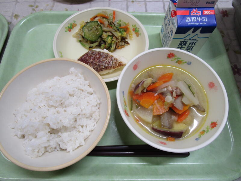 麦ごはん、さつま汁、鯛の塩焼き、白菜の昆布あえ