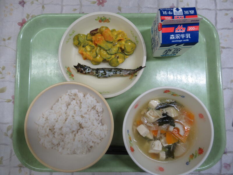 麦ごはん、豆腐汁、青のりししゃも、かぼちゃと豆のサラダ