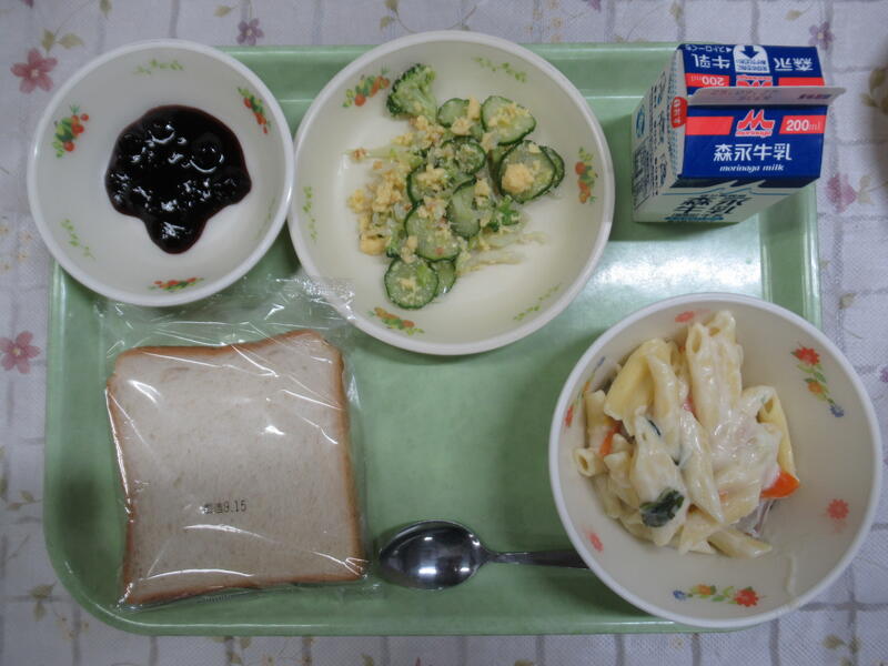 食パン、ペンネのクリーム煮、グリーンエッグサラダ、ブルーベリージャム