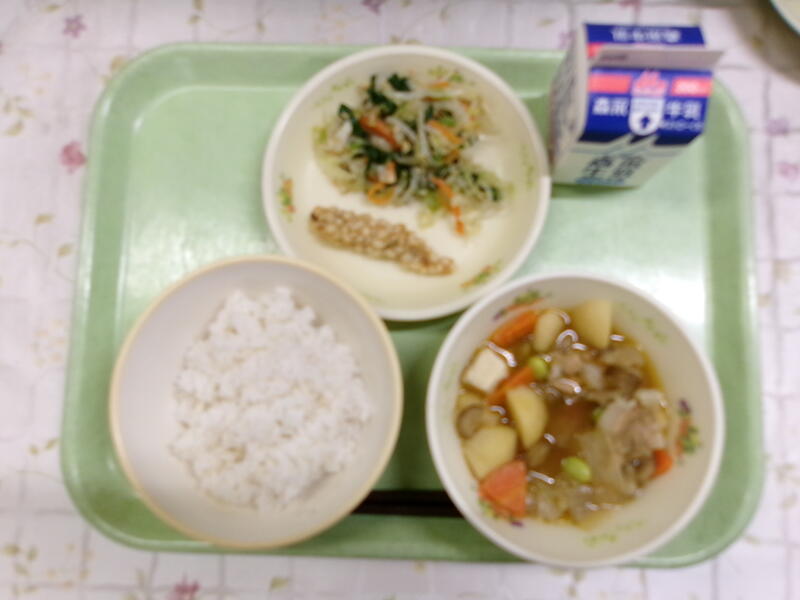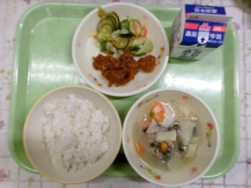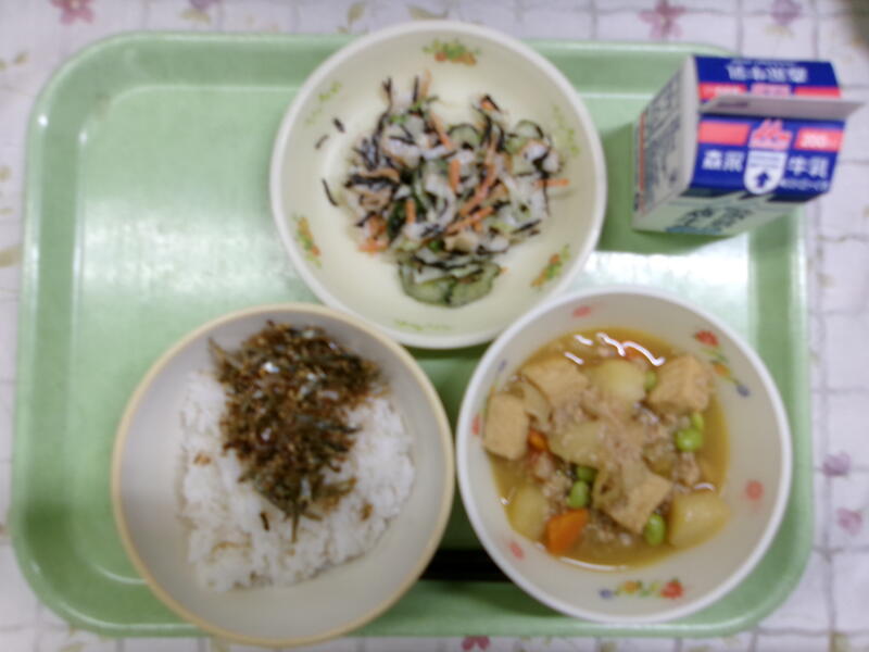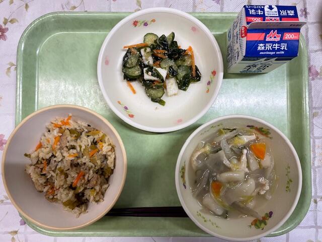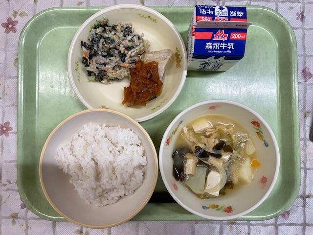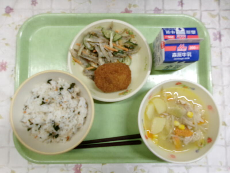 鮭わかめごはん、どさん子汁、北海道かぼちゃコロッケ、かみかみサラダ