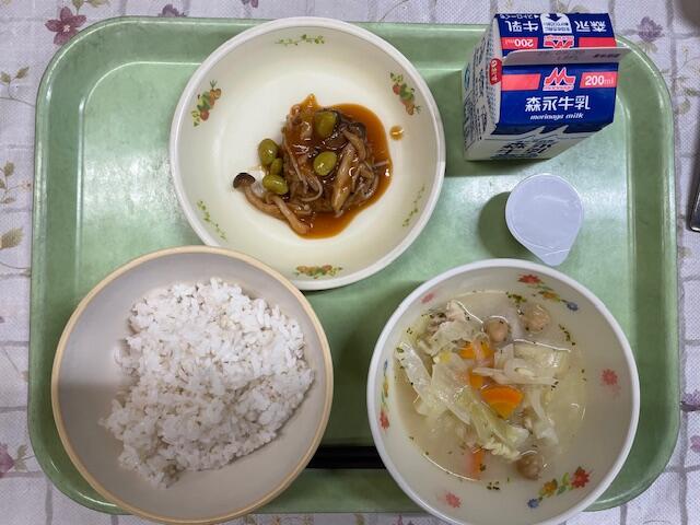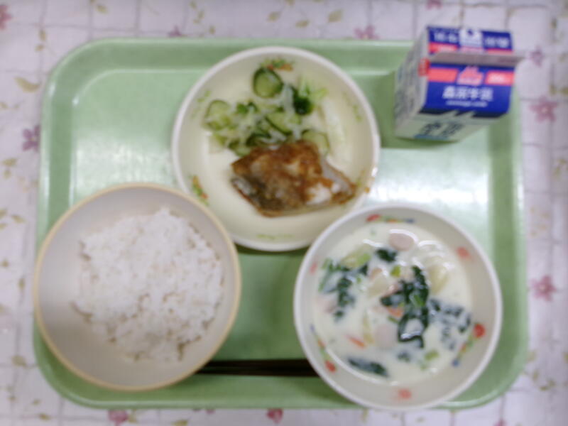 麦ごはん、ミルクスープ、タラのにんにくソース、グリーンサラダ