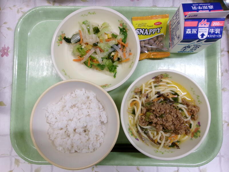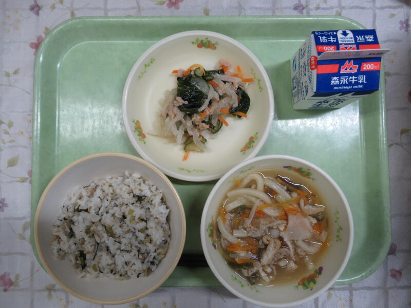 わかめごはん、煮込みうどん、にんじんサラダ、、みかん
