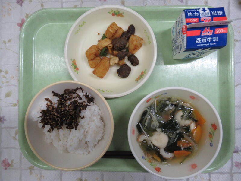 麦ごはん、高野豆腐の卵とじ、切干大根の酢の物、いりこアーモンド