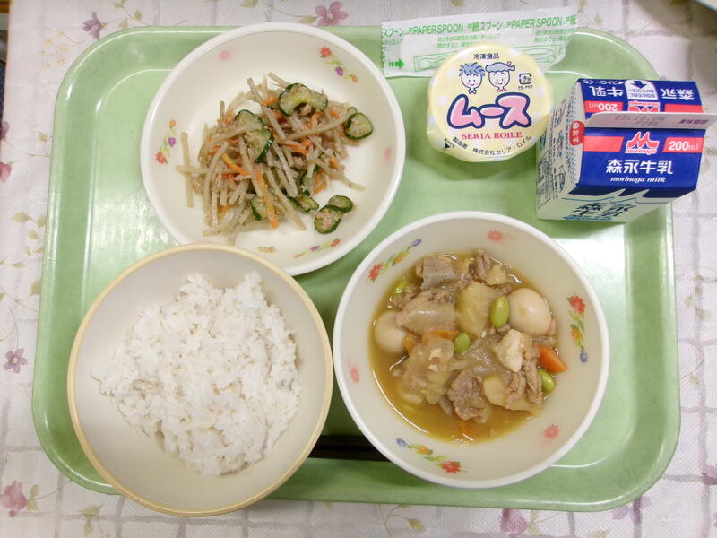 麦ごはん、五目肉じゃが、ごぼうサラダ、ムース