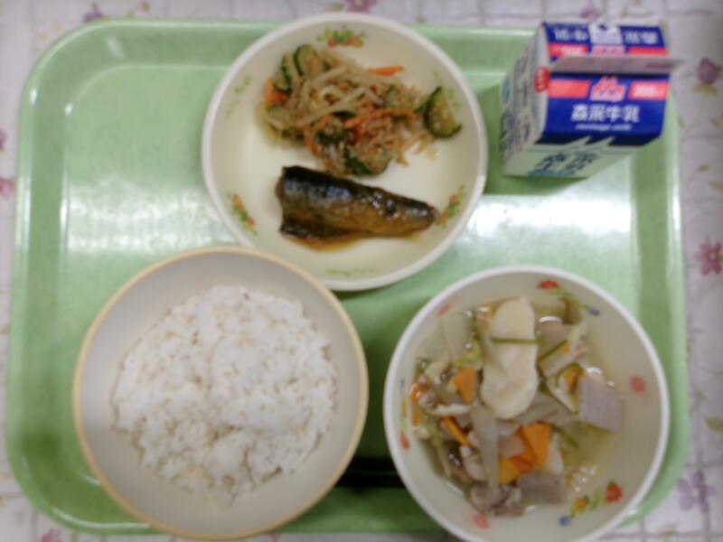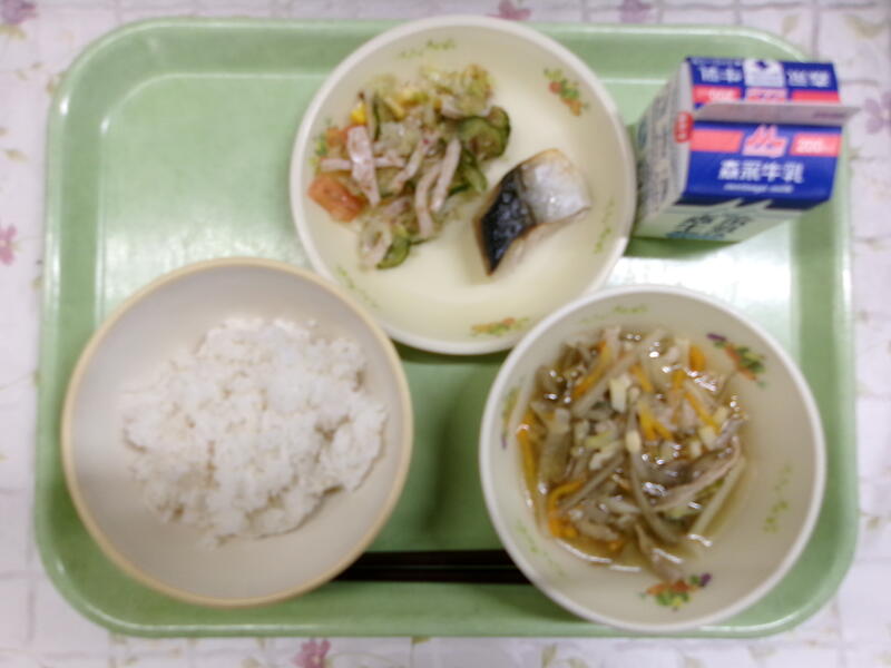 麦ごはん、沢煮椀、さばの塩焼き、りっちゃんサラダ