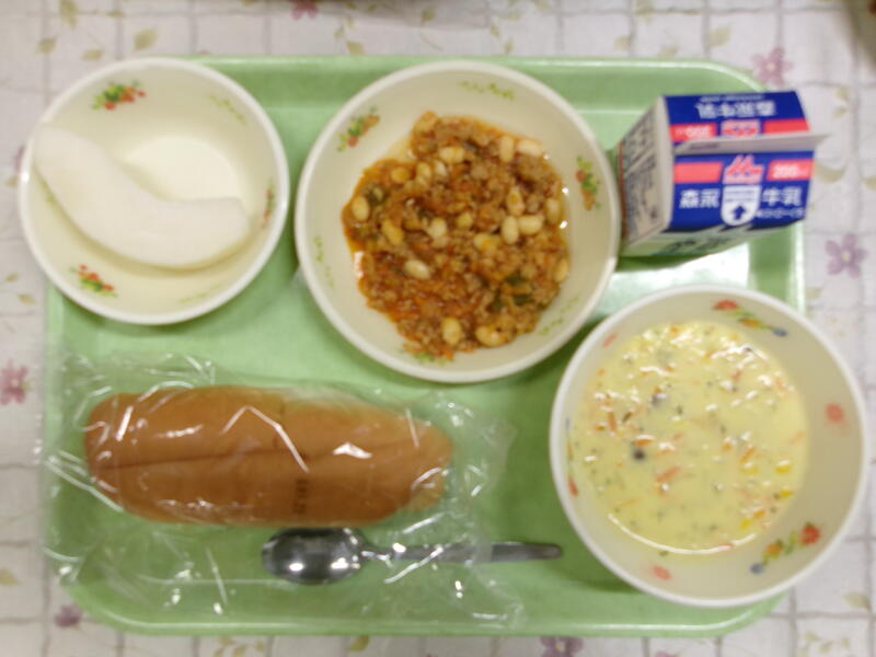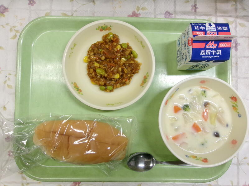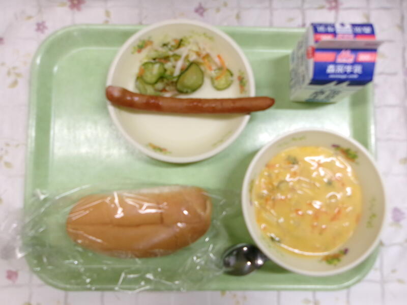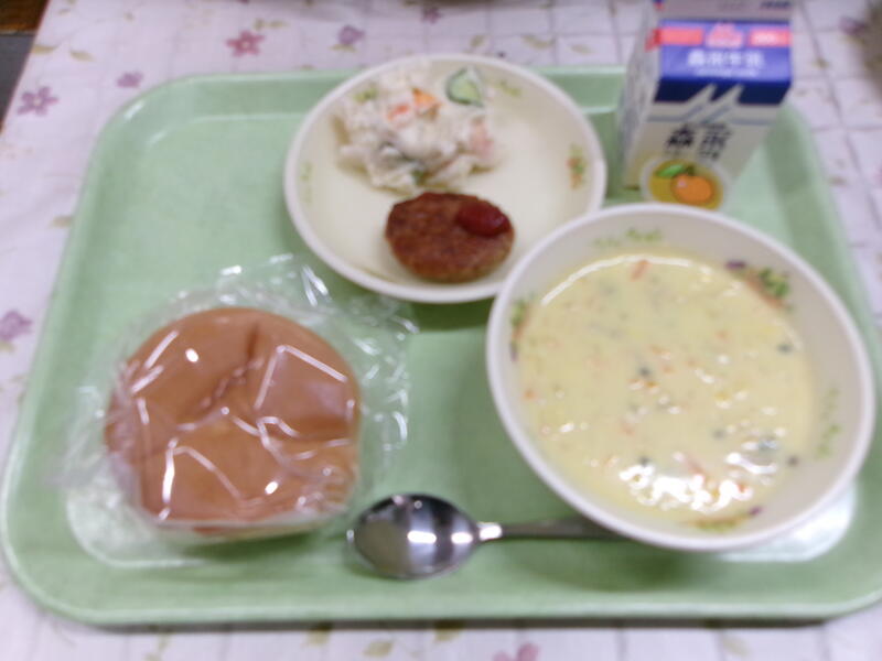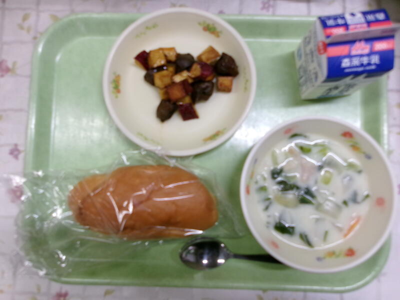 ミルクパン、チンゲンサイのクリームスープ、おさつレバー