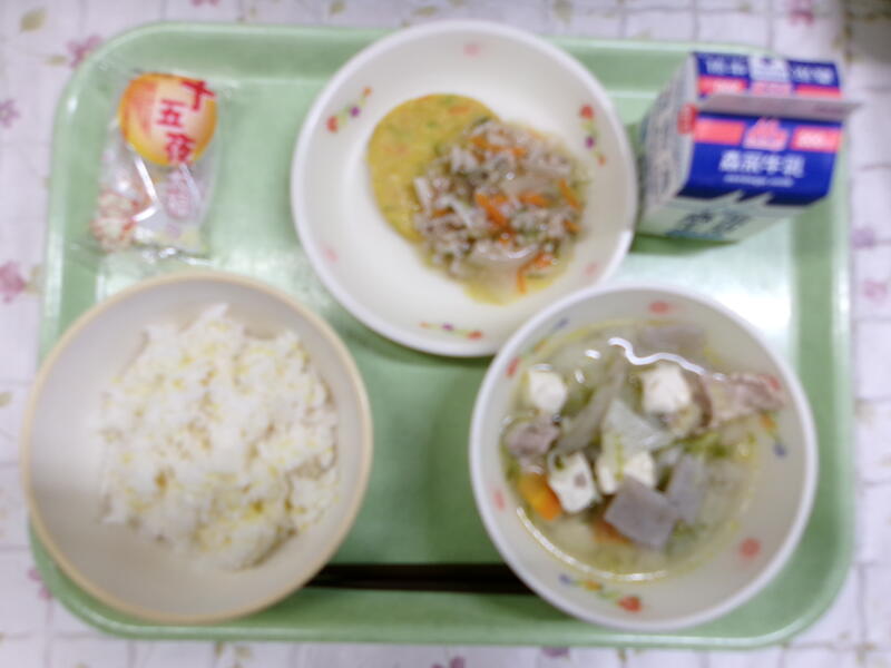 きびごはん、豚汁、お月見しんじょうきのこあんかけ、十五夜大福
