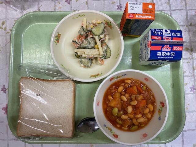 食パン、ポークビーンズ、マカロニサラダ、みかん果汁