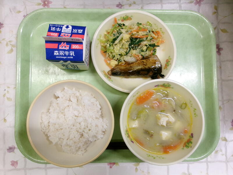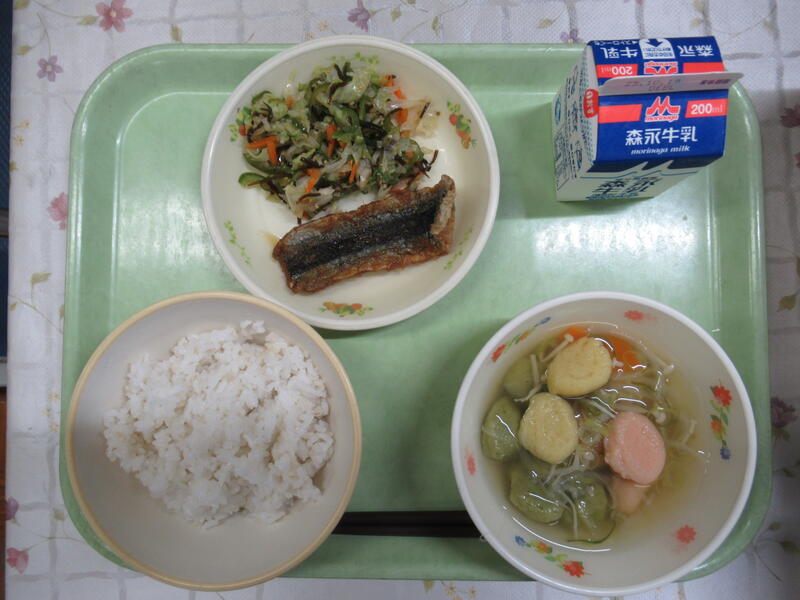 麦ごはん、つみれ汁、ピーマンの昆布あえ、さんまのかば焼き