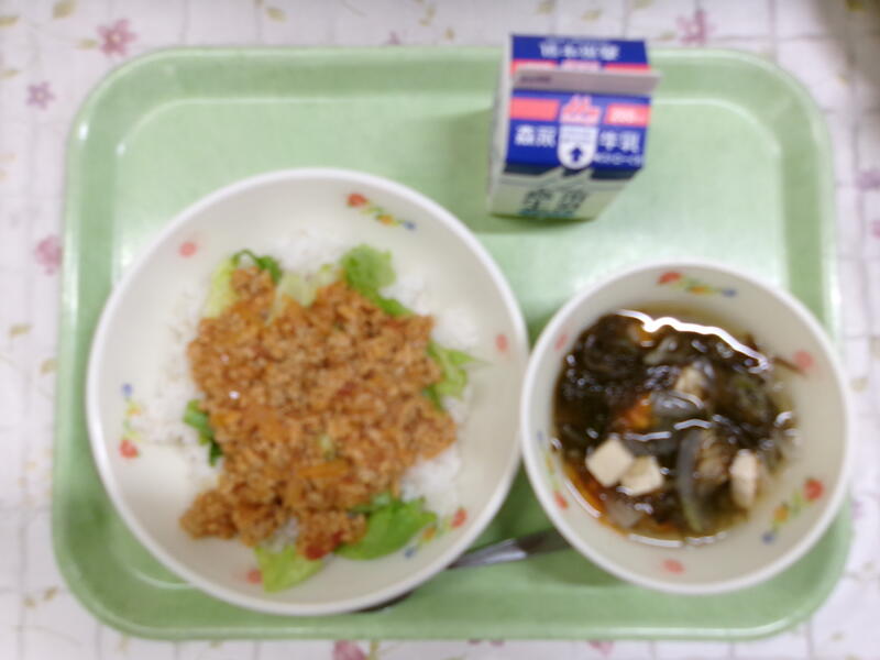 麦ごはん、もずくスープ、タコライスの具、タコライスの野菜