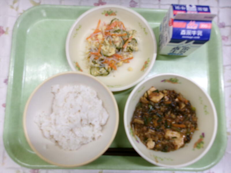麦ごはん、にらのマーボー豆腐、春雨のあえもの