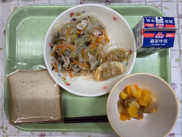 黒糖パン、パリパリ焼きそば、肥後ぎょうざ(2ケ)、柿のフルーツミックス