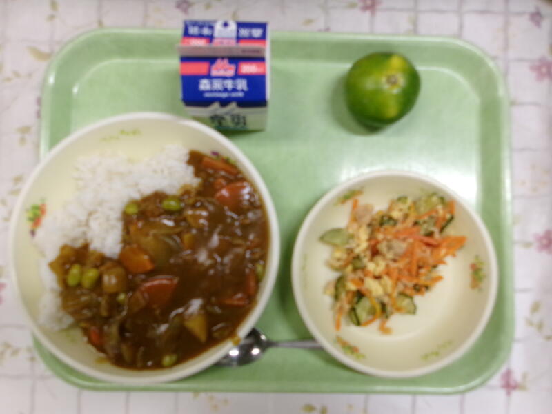 麦ごはん、ポークカレー、にんじんサラダ、みかん