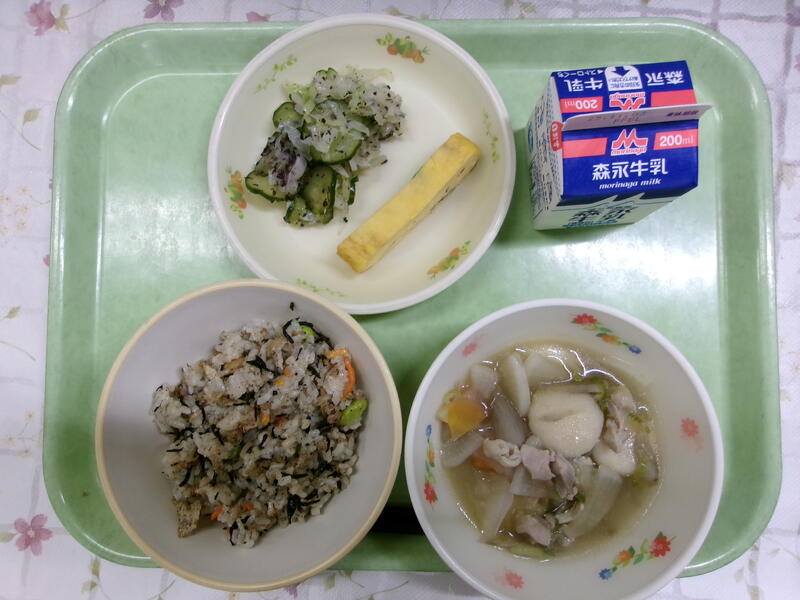 ひじきごはん、秋の幸の団子汁、厚焼たまご、キャベツのしそあえ