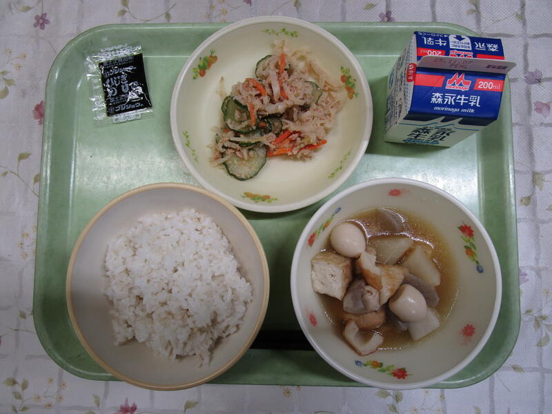 麦ごはん、おでん、切り干し大根のサラダ、ひじきのり佃煮