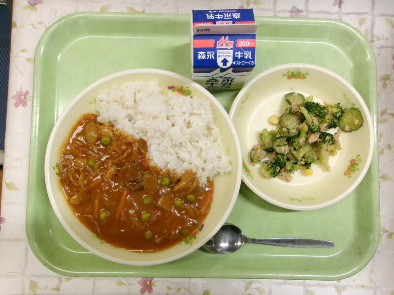 麦ごはん、ハヤシルウ、ツナとブロッコリーのサラダ