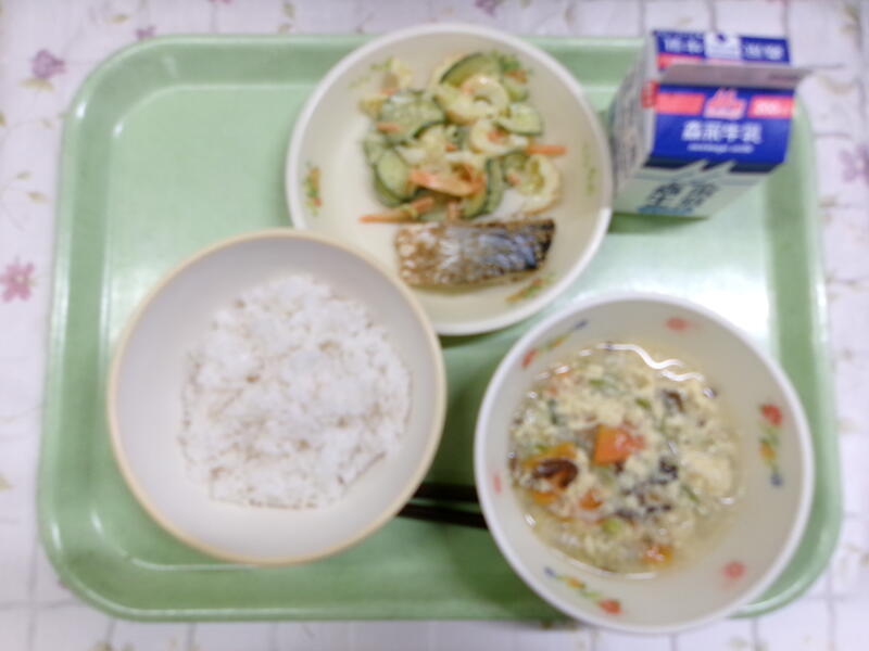 麦ごはん、春雨入りかきたま汁、さばのごま焼き、野菜カレーマヨサラダ