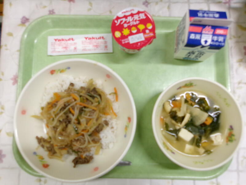 牛丼(麦ごはん)、大根のみそ汁、牛丼の具、ヨーグルト