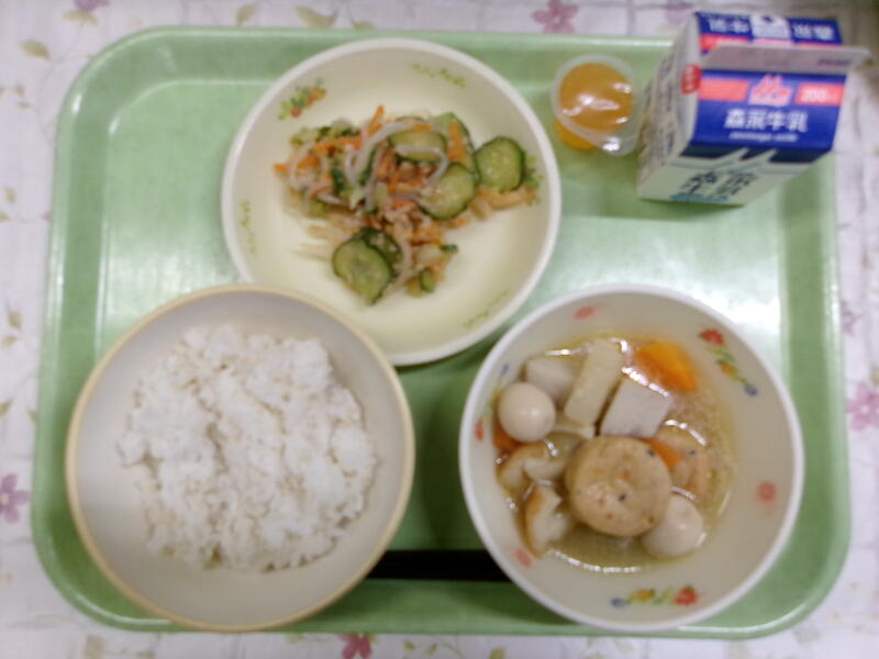 麦ごはん、みそ煮込みおでん、キムチサラダ、高田みかんゼリー