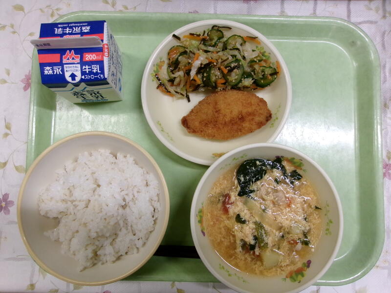麦ごはん、トマトかき玉汁、しいらフライ、即席漬