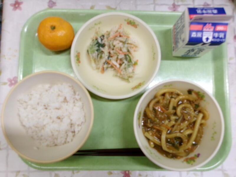 麦ごはん、カレーうどん、チンゲン菜とささみのサラダ、みかん