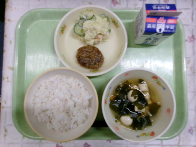 麦ごはん、うずらの卵のすまし汁、ハンバーグのごまみそだれ、ダブルポテトサラダ