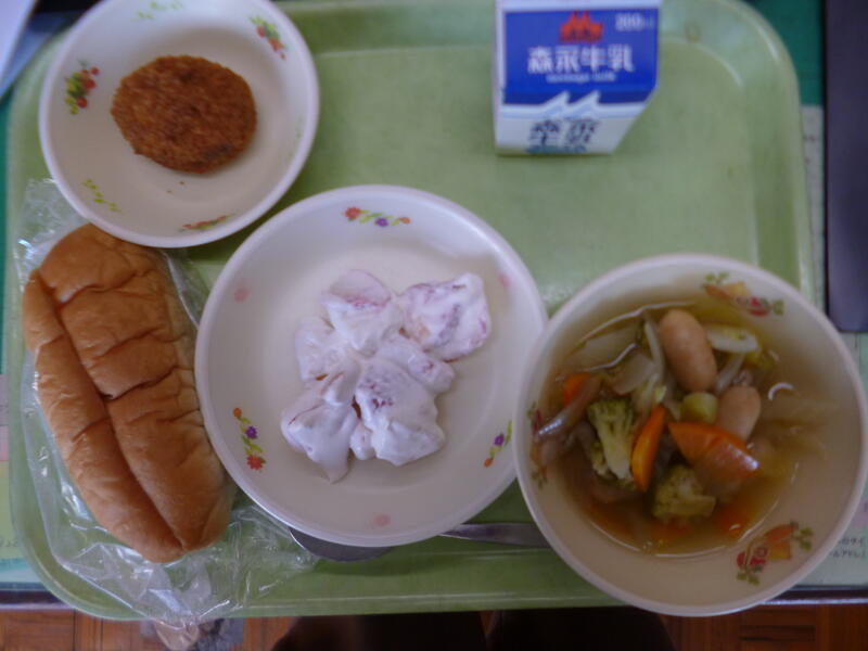 フルーツクリームサンド(パン、フルーツクリーム)、牛乳、ポトフ、いろどり野菜のミンチカツ