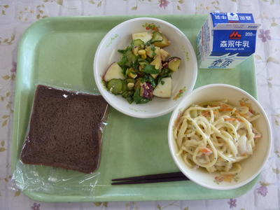 黒糖パン、スープスパゲティ、さつま芋のサラダ、牛乳