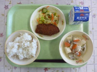 麦ごはん、豚汁、天草真鯛のフライ、キャベツの梅肉和え、牛乳