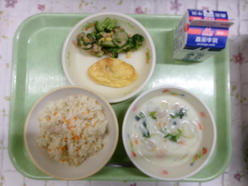 キャロットライス、じゃがいものミルクスープ、オムレツ、ツナとブロッコリーのサラダ