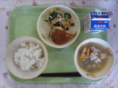 麦ごはん、豚汁、魚のバーベキューソースかけ、ほうれん草のアーモンド和え、牛乳