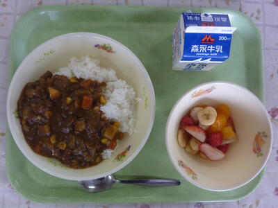 我が家のオリジナルカレー(麦ごはん、コーヒー入りビーフカレールー)、心がホッとするフルーツポンチ、牛乳