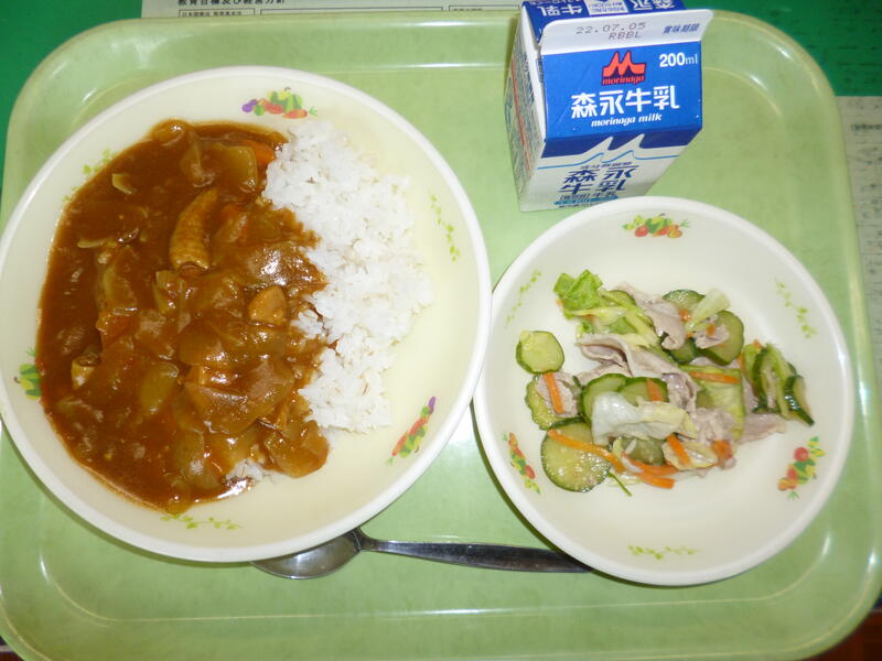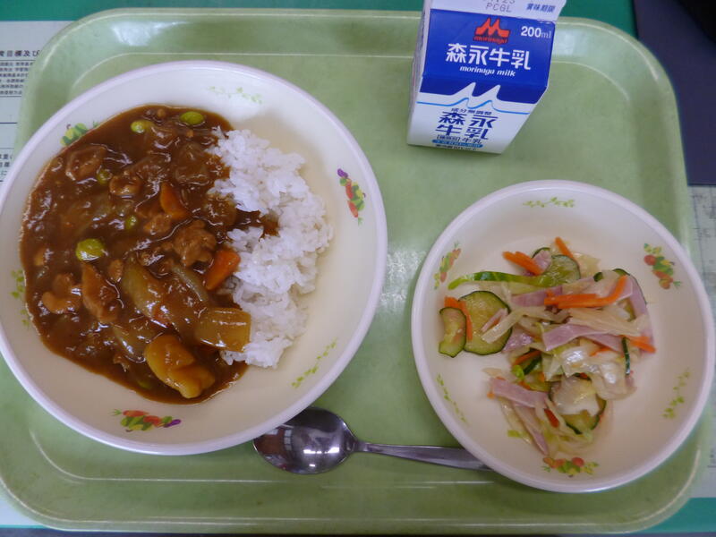 ポークカレー、牛乳、ワカメとツナのサラダ